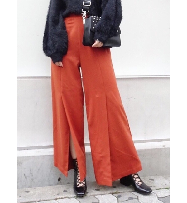 【送料無料】 フロントのスリットが動きのあるシルエットを作り上げるワイドパンツ。肌触りの良い上質な生地感がポイントです。バックウエストがゴム仕様なので履きやすく、トップスをインしたスタイリングもオシャレに決まります。シンプルさの中にトレンドを感じる大人なルックスが魅力の一枚。 ムルーア/MURUA パンツ|その他