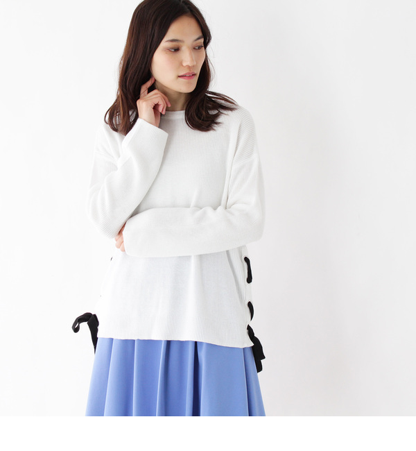 【送料無料】 サイドにあしらったカジュアルなレースアップデザインがかわいいニットプルオーバー。ややゆったりとした雰囲気も今年らしいポイントです。シンプルなシルエットでバランスがとりやすく、スカートにもパンツにも合わせやすい一枚です。ホワイト系(002)は透け感があるため、インナーの着用をおすすめします。モデル情報:身長165cm B73 W58 H85 着用サイズ:02(M)店舗へのお問い合わせ商品番号:C58-14303主に春に着用いただける商品です。 中国製 インデックス/index index|トップス|ニット・セーター