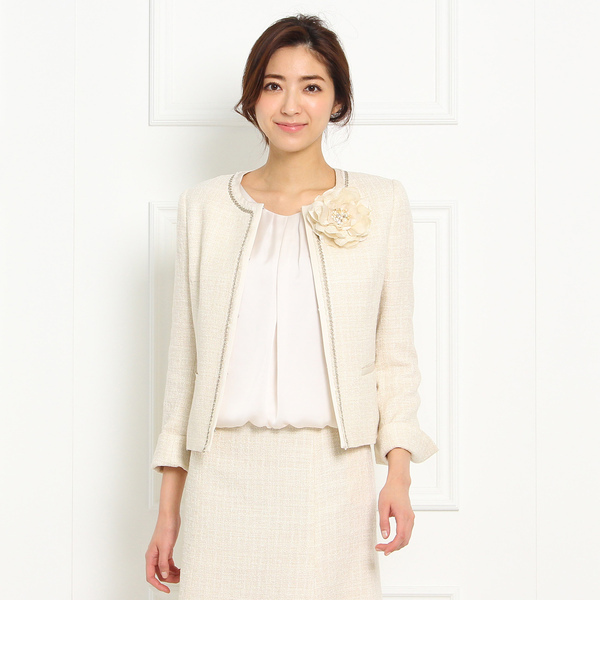 【送料無料】 オフィス、プライベートそれぞれのスタイルに使える、ノーカラーのツイードジャケット。華やかで、目上の方とのお食事会やセレモニーシーンなど、あらたまったお席にも相応しいアイテムです。上品に輝く華奢なラメを織り込み、ツイード素材の絶妙なカラーリングが、フォーマルな印象を高めます。より軽い着心地にこだわり、素材のストレッチ性や軽量化を実現。また、胸より上のスッキリ感は残しつつ、肩幅やアームホール、背中のシルエットを見直し、着用時の動きやすさを目指しました。生地は厚みやウォーム感を抑えているので、季節をまたいで使いやすいのも魅力のひとつ。同素材のスカートやワンピースとのコーディネートはもちろん、単品スカートやきれいめシルエットのパンツとのコーディネートも想定した着丈に仕上げ、着まわしやすさにも配慮しました。こちらの商品はセットアップでご利用いただけます。(画面左上の検索タブで番号検索いただけます)ジャケット:検索番号153-42100、42103ワンピース:153-52100ブラウス:153-82100スカート:153-72100※セットアップでご購入頂く場合カラーナンバーを合わせてご注文下さい。サイズ違いの商品もご用意しております。L:153-42800※商品番号153-42800と153-44800は同素材、同デザインです。モデル情報:身長170cm B82 W58 H85 着用サイズ:02店舗へのお問い合わせ商品番号:153-42100主に春に着用いただける商品です。 日本製 アンタイトル/UNTITLED UNTITLED|ジャケット・スーツ|ノーカラージャケット