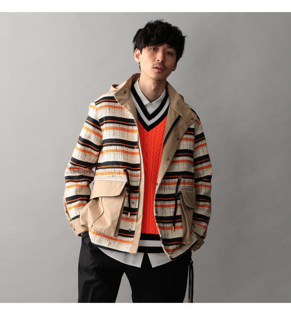 【送料無料】 ★インポート素材ならではのラグジュアリーを纏うストリートブルゾン★流行の先端を創造するイタリアのファブリックメーカー「BONOTTO」の高級ツィード素材。発色のよいカラーリングと光沢糸のミックス感がセンスのよい仕上がり。コットンギャバジン素材のフードやポケット等と切り替えることで、ハイブリット感がプラスされモダンなブルゾンとなりました。また、ロゴ入りのメタル釦やスピンドルなど、細かいディティールまで拘りぬいたデザイン性の高い一着です。モデル(下部ディテール画像):H178 B85 W70 H88 着用サイズ:3 ギルドプライム/GUILD PRIME アウター|ブルゾン・スタジャン