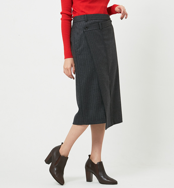【送料無料】 メンズスラックスを解体して巻きスカートにしたようなイメージのスカート。シンプルで適度にハリのあるサキソニー素材をしようしています。ローケージのニットでカジュアルに着こなしても、ハイゲージニットで大人っぽく仕上げても、どちらでもおしゃれです。ブラック:model:H167・ B77・ W56・ H80 着用サイズ:38チャコール:model:H160・B80・W69・H86 着用サイズ:38 アバハウス・ドゥヴィネット/Abahouse Devinette Abahouse Devinette|スカート|スカート