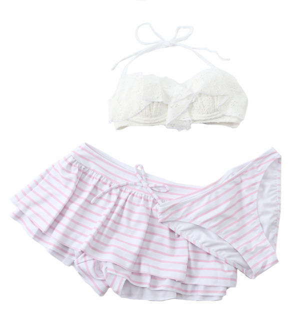 【送料無料】 スウィート×カジュアルの絶妙なバランスでおしゃれ上級者をアピールできるスイムウェア3点セット。ふんわりとしたレイヤードデザインが印象的なブラトップは高級感のあるレース仕立て。ミニスカート風ショートパンツとボトムはガーリーな色使いのボーダー柄になっています。 サンアイミズギラクエン/三愛水着楽園 水着・スポーツ|ビキニ
