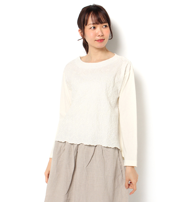 【3000円(税込)以上で送料無料】 柔らかなカットソーにシックな刺繍をドッキングしたブラウス。着心地の良さはもちろん、フェミニンさを演出してくれる女性らしさ溢れる一着です。定番ボトムスとのコーディネートもサマになる1枚は、ワードローブの即戦力として広く愛用できそう。 サマンサモスモス/Samansa Mos2 トップス|Tシャツ・カットソー,シャツ・ブラウス