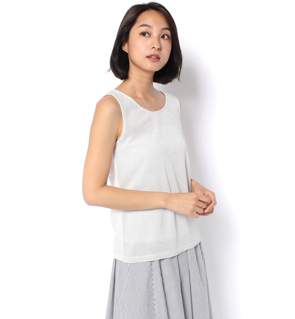 【送料無料】 前後で異素材を組み合わせた2WAY仕様のノースリーブです。ニット部分はラメ入りで、カジュアルな中にも華やかさのある印象に。布帛部分はブラウス見えするので、ビジネスシーンでジャケットのインナーにも活躍します。ベーシックなフォルムなのでカジュアルやフォーマルにも合わせられ、どんなアウターやレイヤードも悩むことなく組み合わせることが出来ます。 アンディコール/un dix cors トップス|キャミソール