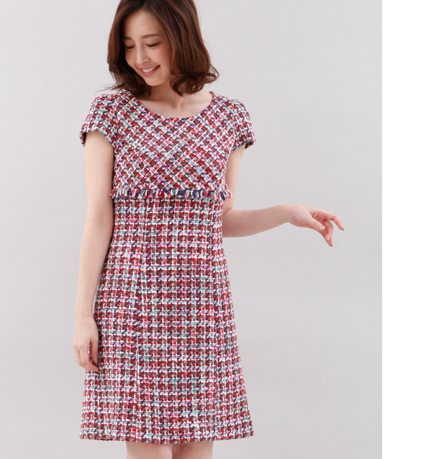 【送料無料】 チェックツイードが華やかなワンピースです。切り替えのフリンジがアクセントになり、女性らしいシルエットがメリハリのあるボディーラインに仕上げます。パーティーやオケージョンシーンで着用していただける一着です。小物合わせで、様々な表情を演出することができます。・裏地あり・後ろファスナー付き ・ポケット付き エフデーゼ/EFDEISEE ef-de|ワンピース|その他