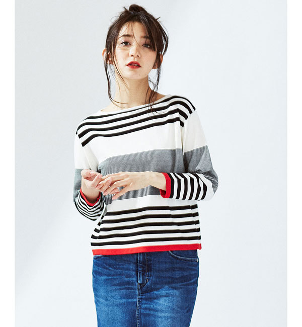 【送料無料】 オリジナルでピッチを組んだ、新鮮なデザインのボーダーニット。ボートネックのベーシックなシルエットに袖や裾の配色が映え、ニュアンスのあるアクセントをプラス。レーヨン混の程よい光沢が大人っぽい雰囲気で、カジュアルなボーダーアイテムを品良くシフトしてくれる大人にオススメの一枚です。 ・他にはないオリジナルのボーダーピッチ・レーヨン混の光沢がカジュアルアイテムを上品にシフト・寒さが残る時期から初夏まで長く着られる程よい厚み・様々なボトムに馴染むシルエット・ポイントになる袖と裾の配色model: H172cm 着用サイズ:38◆nano・universe◆■洗濯表示■家庭での洗濯禁止塩素系及び酸素系漂白剤の使用禁止タンブル乾燥禁止底面温度110℃を限度としてアイロン仕上げができる石油系溶剤による弱いドライクリーニングができるウェットクリーニング禁止 ナノ・ユニバース/nano・universe nano・universe Ladys|トップス|ニット・セーター