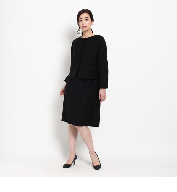 【送料無料】 ドレステリア定番のオケージョン対応ブラックフォーマルシリーズ。素材は二度染めをして深みのあるリアルなブラックを表現しており、光沢の少ない生地なのでワードローブの中に溶け込みやすいのがポイント。シワがつきにくく、お取り扱いしやすいアイテムです。こちらのワンピースはウエストを絞らず、裾に向かってストレートなベーシックシルエット。お手持ちのベルトを使用してウエストを絞るアレンジも出来ます。パターンは身頃と袖を繋げており、やわらかい女性らしい肩のシルエットを意識。5分袖なので重たく見えすぎず、オールシーズン着用が可能です。同素材のジャケット(085-44300)と合わせたセットアップでの着こなしもおすすめです。モデル情報:身長165cm B80 W57 H84 着用サイズ:38(M)店舗へのお問い合わせ商品番号:085-54300春夏を通じて着用いただける商品です。 日本製 ドレステリア/DRESSTERIOR DRESSTERIOR|ワンピース|ワンピース